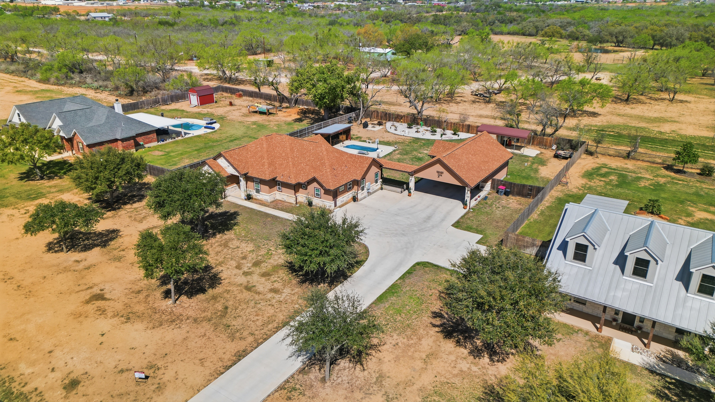 Peaceful country living on .75 acre in Lytle, Texas, just minutes from San Antonio. This custom single-story home features 4 bedrooms and 3 full bathrooms, offering plenty of space for everyday living and entertaining. The backyard is designed for relaxation with a sparkling pool and cabana area, perfect for enjoying warm Texas evenings.